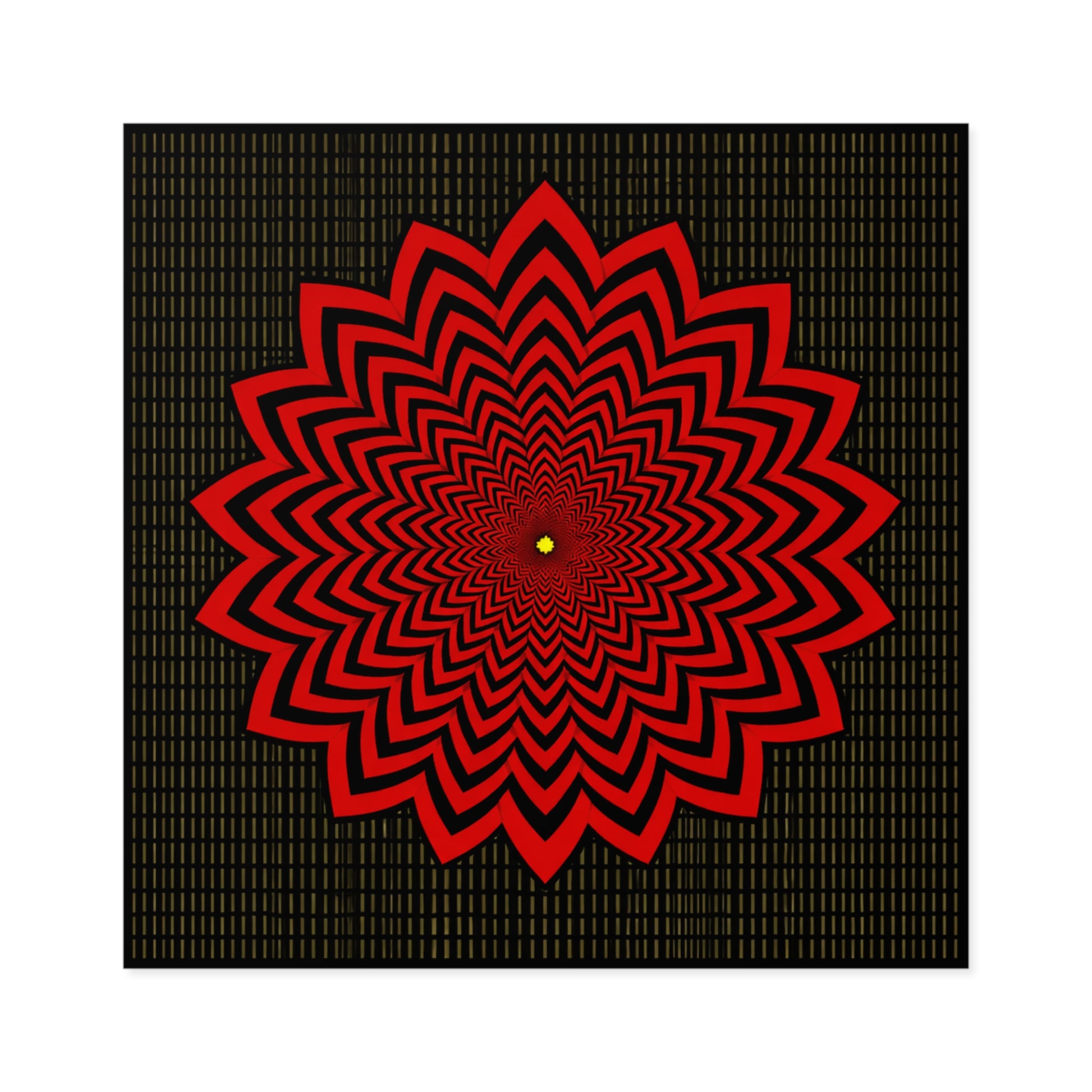 Bold and hypnotic, this square vinyl sticker brings an electric pop of red against a deep textured black grid. The layered starburst pattern draws the eye inward, creating a dynamic focal point whether it’s on a laptop lid, water bottle, or sketchbook. It sticks smoothly, resists water and scratches, and keeps its vibrant hues through daily wear — so the design remains as striking as the day you put it down. Stick it where you want a graphic jolt of energy and a little optical thrill.
