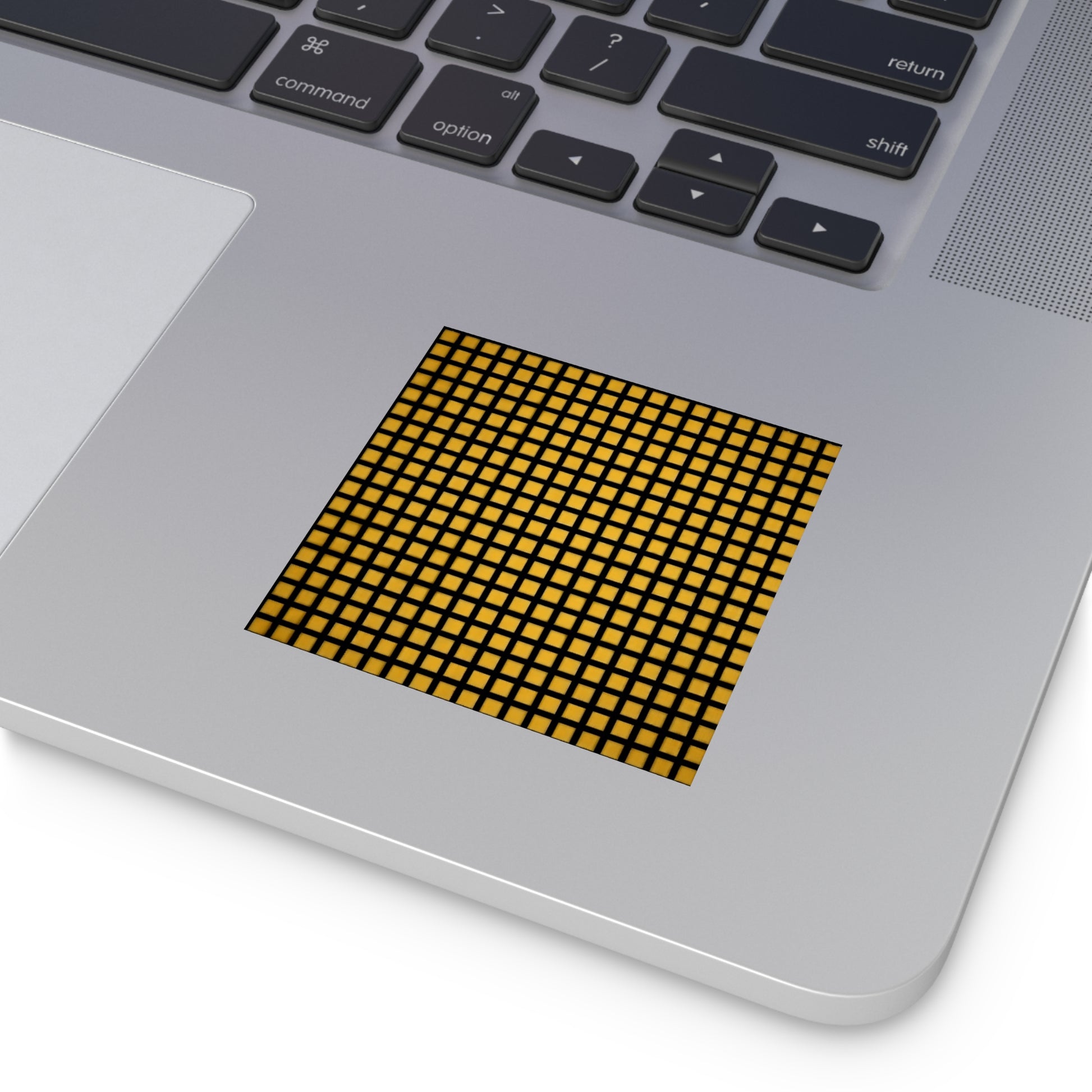 A bold, graphic vinyl square sticker that brings retro grid energy to whatever you stick it on. The high-contrast black lattice sits over a warm golden background — like a modern take on mid-century screen patterns — and reads as both minimalist and statement-making. The premium vinyl feels substantial and smooth, and the protective laminate keeps the color punchy and the edges looking fresh even after being handled, stuck to water bottles, laptops, or outdoor gear. Place it on a sketchbook, phone case, or planner to add a tidy pop of geometric rhythm that ages well and resists scratches and rain.